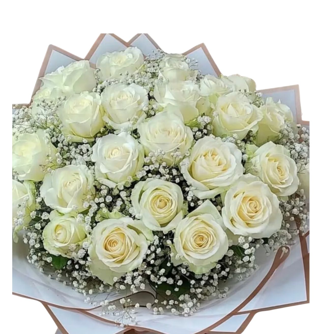 זר מרשים של 25 ורדים לבנים עם גיבסניות במראה נקי ויוקרתי.